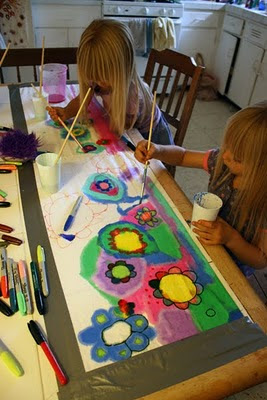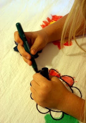 Dê canetinhas para as crianças começarem a colorir e a marcar o desenho, e com "Tinta de Tecido" pinte todo o caminho, sem deixar espaços vazios.